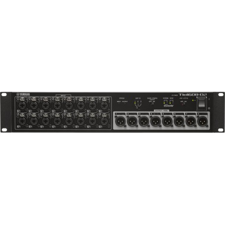 Einfache, vielseitige, hochauflösende Dante-Stagebox Die Tio1608-D2 ist ein Dante-kompatibles I/O-Rack mit 16 Mikrofon-/Line-Eingängen und 8 Line-Ausgängen. Es kann die Gain von Konsolen der TF-Serie und DM3 fernsteuern und ermöglicht so den Aufbau eines einfachen Stagebox-Systems. Der vielseitige Tio1608-D2 unterstützt auch 96k und eignet sich daher perfekt für den Einsatz als I/O-Rack in großen Installationen mit Produkten wie RIVAGE PM oder DME7. Die Vielseitigkeit und Skalierbarkeit von Dante Der Dante-Audionetzwerkstandard wird in den DM3- und TF-Serien sowie in den digitalen Mischpulten CL und QL verwendet. Diese Konsolen können frei mit dem Tio1608-D2 oder einem I/O-Rack der R-Serie kombiniert werden, um ein System zu erstellen, das der erforderlichen Größe und dem erforderlichen Budget entspricht. Das Patchen kann über „Dante Controller“ aktiviert werden, während Remote HA über die Software „R Remote“ gesteuert werden kann. *Bitte beachten Sie, dass Remote HA auf dem Tio1608-D2 nur über den primären Port implementiert werden kann. Die Remote-HA-Steuerung des Tio1608D2 ist im sekundären Netzwerk nicht verfügbar, selbst wenn das Produkt in Kombination mit einer TF- oder CL/QL-Konsole verwendet wird. Eine Stagebox, die den Komfort Ihrer Konsole erhöht Yamaha I/O Rack Tio1608-D2: Eine Stagebox, die den Komfort Ihrer Konsole erhöht Der Tio1608-D2 ist die ideale Stagebox für die Verwendung mit der TF-Serie oder DM3. Die TF-Serie kann mit der optionalen NY64-D-Erweiterungskarte eine Verbindung zu bis zu drei Tio1608-D2-Einheiten herstellen, während DM3 eine Verbindung zu einer einzelnen Einheit herstellen kann. Die Verbindung der Konsole und des Tio1608-D2 über ein leichtes, langlebiges CAT5e-Ethernet-Kabel in einer Daisy-Chain-Verbindung ermöglicht eine Tonübertragung mit geringer Latenz und hoher Qualität ohne den zeitaufwändigen Transport und die Installation, die bei der Verwendung analoger Schlangen erforderlich sind. Dante High Reliability Network Audio Protocol Yamaha I/O Rack Tio1608-D2: Dante High Reliability Network Audio Protocol Dante wurde von führenden Herstellern und Fachleuten in der Beschallungsbranche aufgrund seines geringen Jitters, der geringen Latenz und der hohen Sampling-Genauigkeit übernommen. Mit dem Tio1608-D2 können Sie problemlos ein leistungsstarkes Dante-Stagebox-System konfigurieren, ohne dass Sie über geringe oder keine IT-Netzwerkkenntnisse verfügen. Dank der Flexibilität des Dante-Netzwerkprotokolls können TF-Serien oder DM3 mit einer Vielzahl Dante-fähiger Geräte wie z. B. I/O-Racks der R-Serie verbunden werden. Schnelle und einfache Konfiguration Yamaha I/O Rack Tio1608-D2: Schnelle und einfache Konfiguration Die TF-Serie und DM3 sind mit Funktionen zur automatischen Konfiguration von Netzwerkeinstellungen und Audio-Patching-Verbindungen ausgestattet, was die Systemkonfiguration vereinfacht. Nachdem Sie die Geräte-ID und die QUICK CONFIG-Schalter über die Vorderseite des Tio Rack konfiguriert haben, können Sie mit der QUICK CONFIG-Funktion der TF-Serie oder der AUTO CONFIG-Funktion des DM3 die Einrichtung abschließen, indem Sie einfach die Konsole und das Tio Rack mit einem verbinden Ethernet Kabel. Schalten Sie den Strom ein und schon kann es losgehen! *Stellen Sie den QUICK CONFIG-Schalter auf ON, wenn Sie Quick CONFIG auf der TF-Serie verwenden, und auf OFF, wenn Sie AUTO CONFIG auf dem DM3 verwenden. Einfache und flexible Eingangsauswahl Yamaha I/O Rack Tio1608-D2: Einfache und flexible Eingangsauswahl Sobald die Grundkonfiguration abgeschlossen ist, können Sie die Eingänge ganz einfach so zuweisen, dass sie am besten zu Ihrem System-Setup passen. Alle Eingänge können im Handumdrehen über das INPUT-Bildschirmmenü der TF-Serie oder den PATCH-Bildschirm eines DM3 einheitlich dem Tio Rack zugewiesen werden. Benutzer können auch jeden Eingang ändern, um Signale von mehreren Standorten zu empfangen, wodurch alle Eingänge effektiv genutzt werden können. Rückrufbare D-PRE-Vorverstärker Yamaha I/O Rack Tio1608-D2: Rückrufbare D-PRE-Vorverstärker Der Tio1608-D2 übernimmt die natürliche, musikalische Sensibilität, die wir bei der Entwicklung der TF-Serie verfolgt haben. Der mechanische Aufbau, das Schaltkreis , die Stromversorgung, die Erdung und die Teileauswahl wurden alle mit größter Liebe zum Detail und zur Qualität ausgeführt, kombiniert mit umfassenden Leistungs- und Hörtests in jeder Entwicklungsphase. Der Tio1608-D2 verfügt über die gleichen abrufbaren D-PRE-Mikrofonvorverstärker wie die TF-Serie, um im gesamten System einen konsistenten, natürlichen, musikalischen Klang zu liefern. Systembeispiel mit DM3 Yamaha I/O Rack Tio1608-D2: Systembeispiel mit DM3 Tio1608-D2 ermöglicht den einfachen Anschluss eines digitalen DM3-Mischpultsystems. Das System-Setup verwendet eine Plug-in-and-Play-Methode. Einfach Cat5e-Kabel anschließen, Geräte-IDs auswählen und schon ist das System betriebsbereit. Die HA-Fernsteuerung ist über Cat5e verfügbar. Die StageMix-App ermöglicht die drahtlose Fernsteuerung der Konsole von der Arena, der Bühne oder dem Publikum usw.