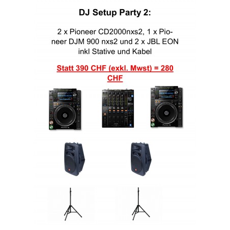 2 x Pioneer CD2000nxs2, 1 x Pioneer DJM 900 nxs2 und 2 x JBL EON inkl Stative und Kabel